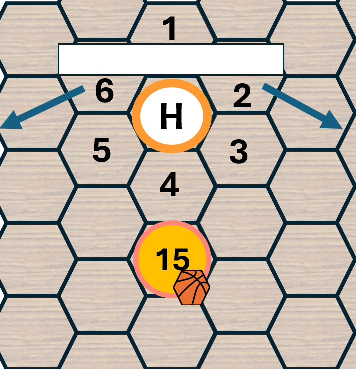 Each number on the D6 maps to one of the 6 hexes adjacent to the Ball Handler. The number 1 is always mapped to the hex that is closest to the hoop. The number continue in a Clockwise fashion (where 1 is equal to 12 on a clock face) around the Ball Handler.